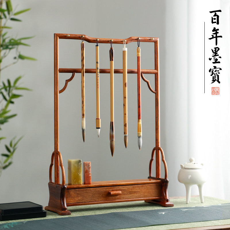 入相红木多宝笔挂实木一体式抽屉式毛笔架简约素雅新中式文房桌面摆件书法国画用品毛笔架桌面收纳文房四宝