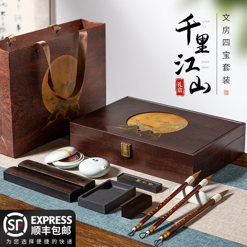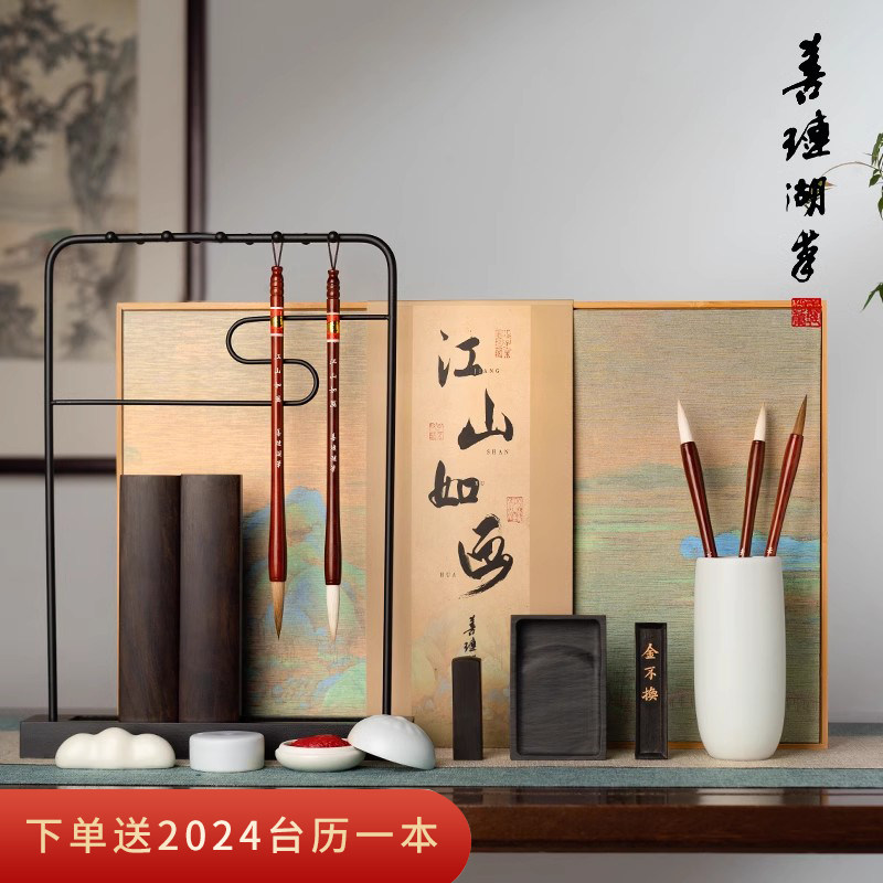 善琏湖笔 江山如画 文房四宝套装毛笔架宣纸歙砚台初学者专用书法墨条套装国画毛笔礼盒笔墨纸砚全套笔挂