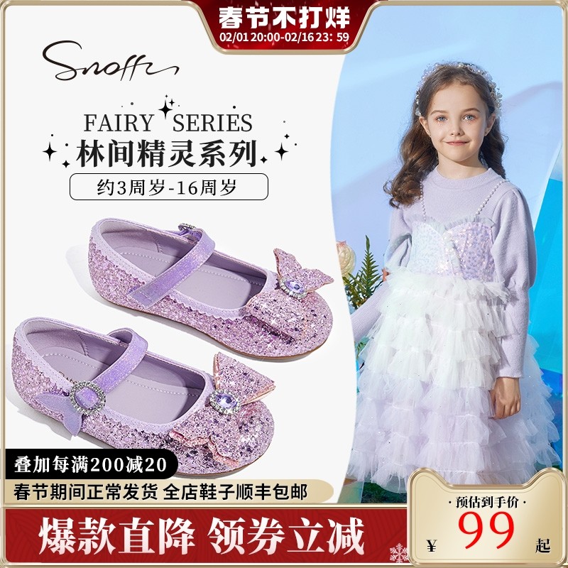 Snoffy斯纳菲爱莎公主水晶鞋2024春秋款儿童皮鞋软底女童闪亮单鞋