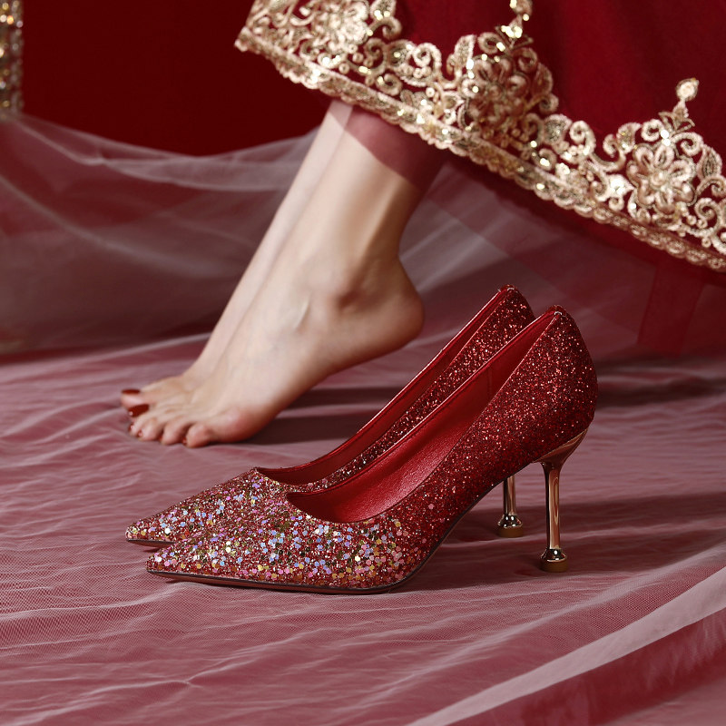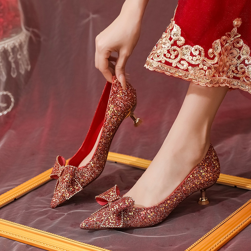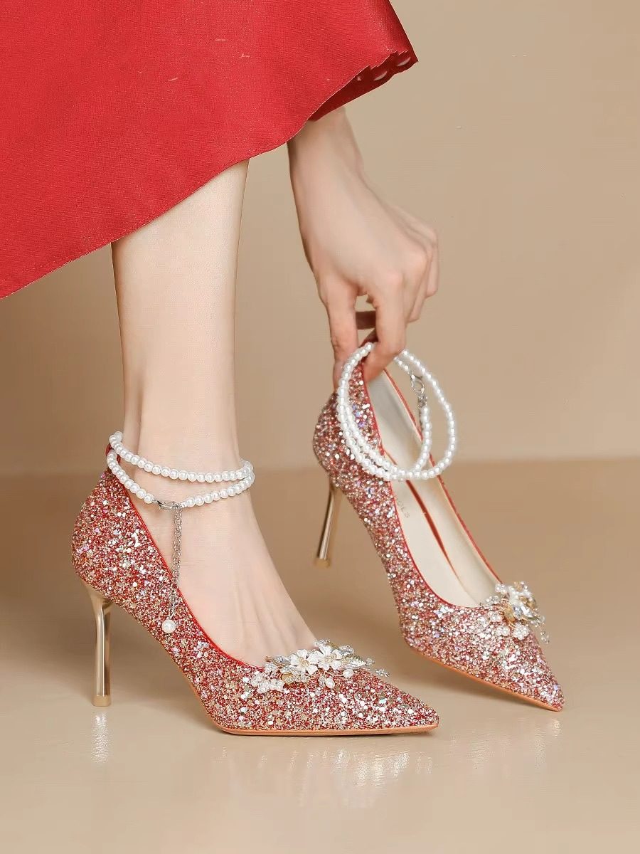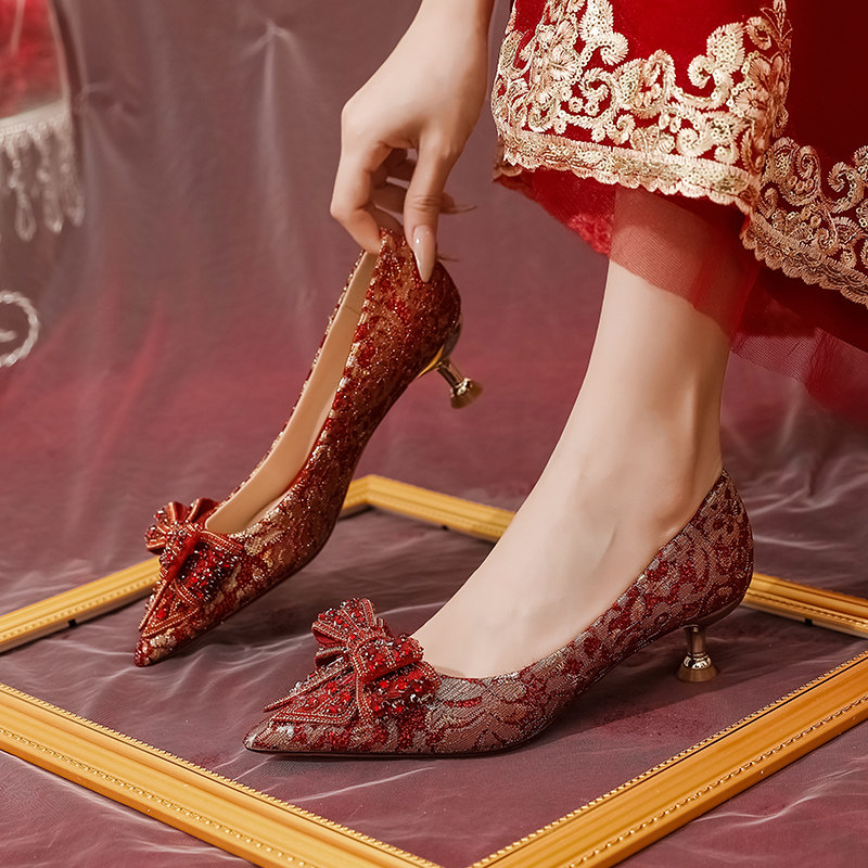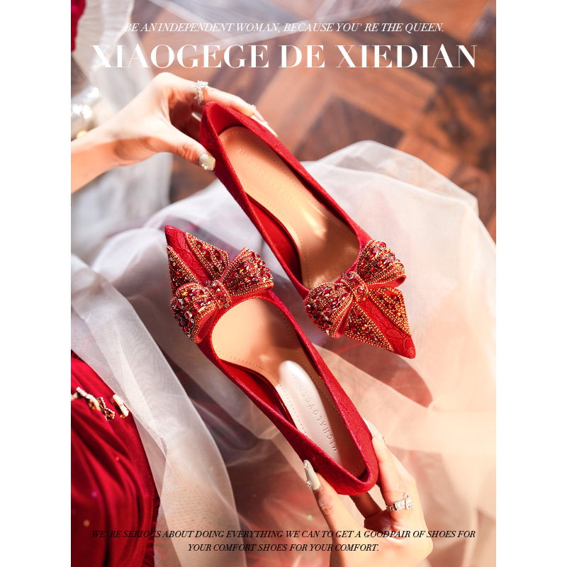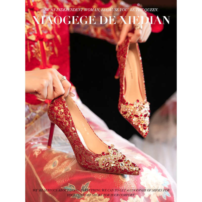婚鞋秀禾服水晶高跟鞋红色新娘鞋不累脚尖头水钻显白婚纱敬酒两穿