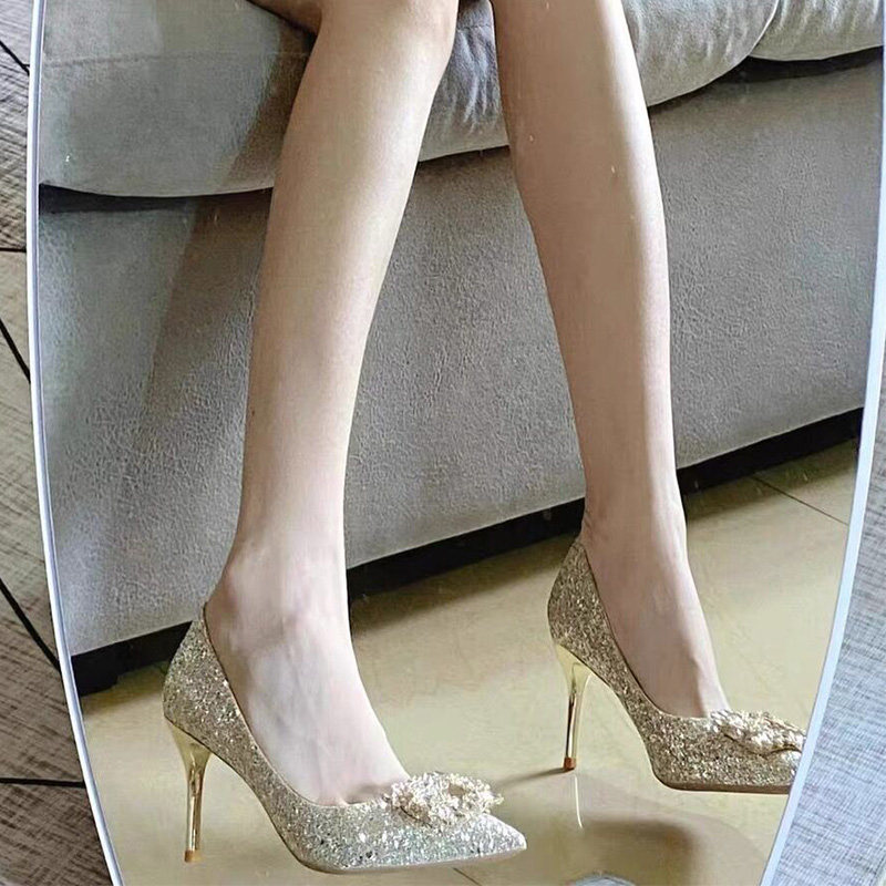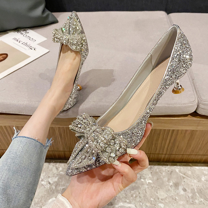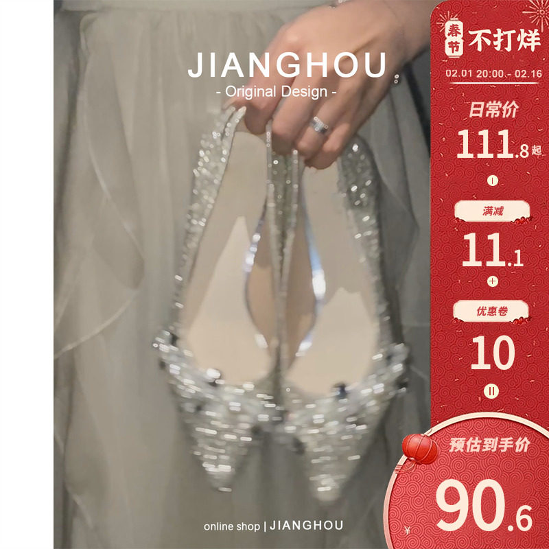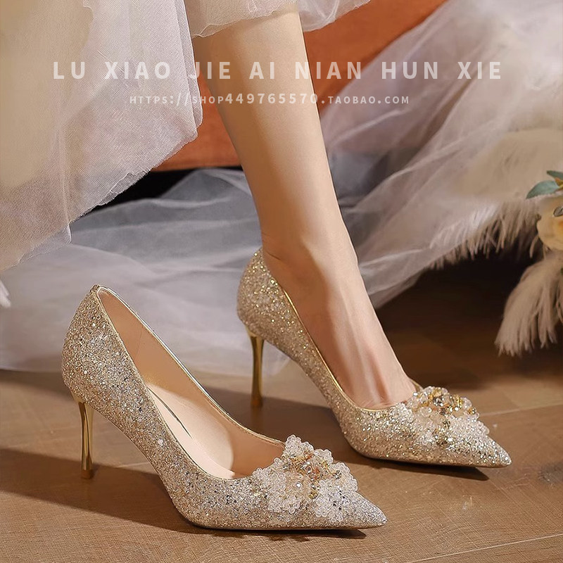 婚鞋女2023新款结婚新娘婚纱水晶鞋细跟尖头亮片高跟鞋伴娘礼服鞋