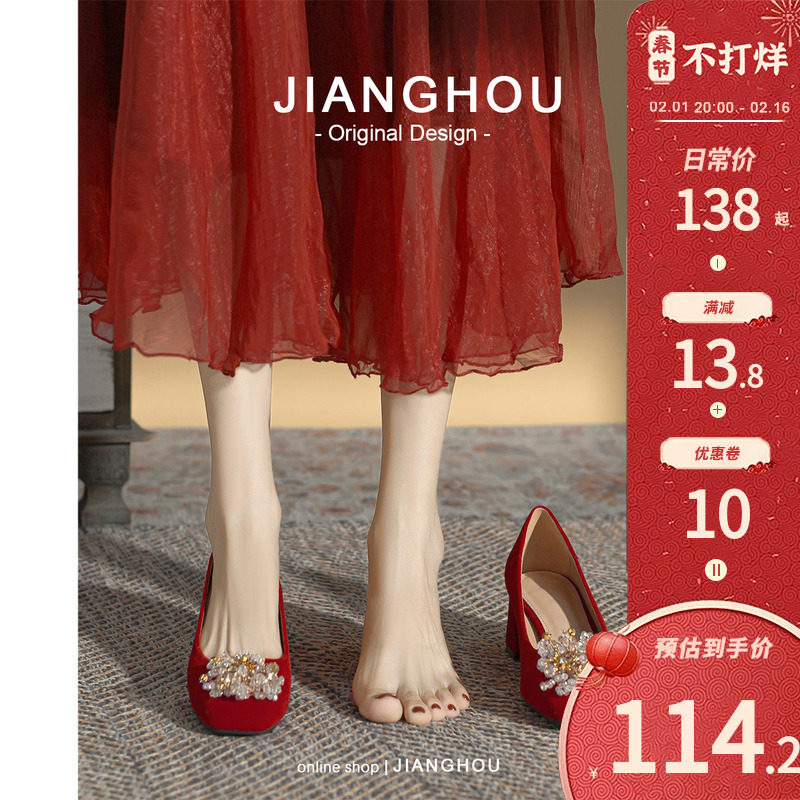 真皮~匠逅女鞋秀和服婚鞋中式新娘敬酒服低跟单鞋粗跟闪钻水晶鞋