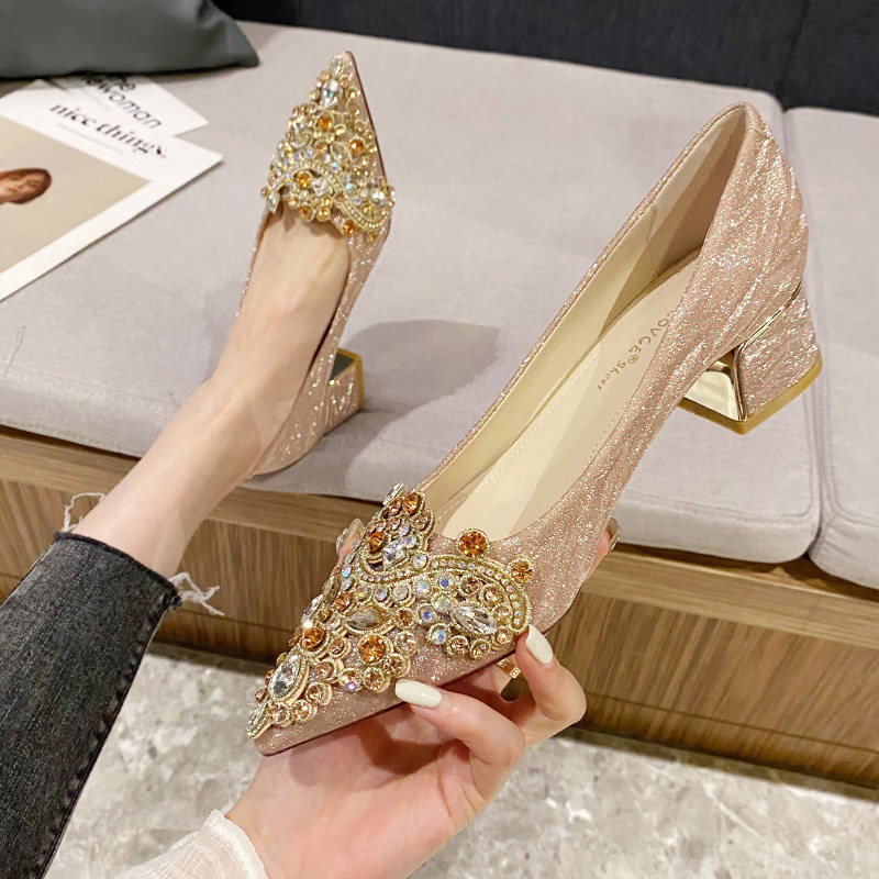 金色婚鞋2023年新款新娘鞋主婚纱高跟鞋女3cm低跟单鞋订婚水晶鞋