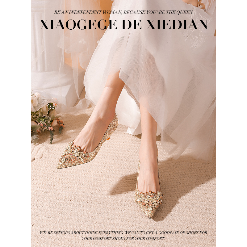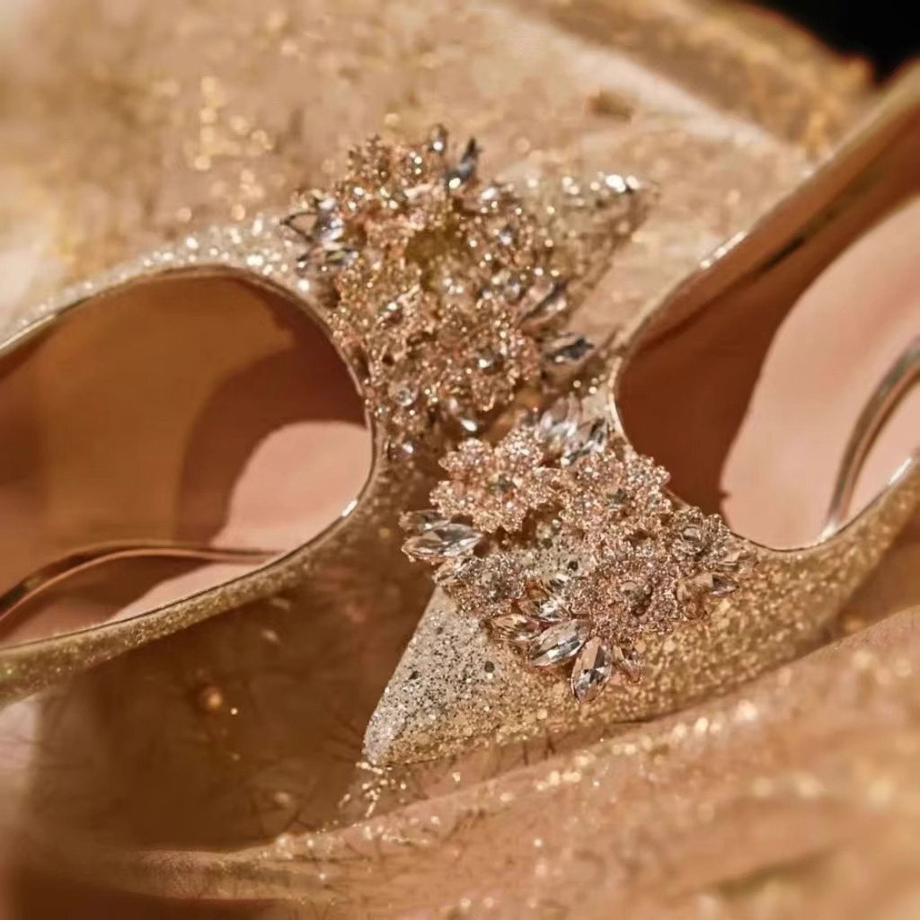 香槟色婚鞋主婚纱秀禾两穿敬酒水晶鞋新娘鞋金色订婚细跟高跟鞋女