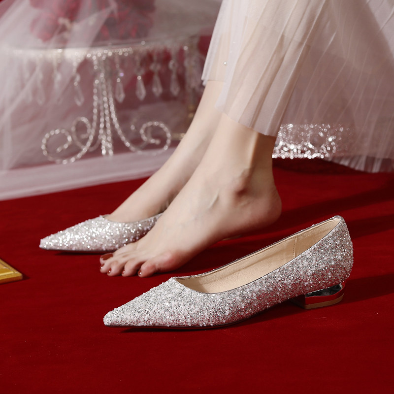 香槟色婚鞋新娘鞋2023年秋冬银色订婚水晶鞋低跟高跟鞋女伴娘单鞋