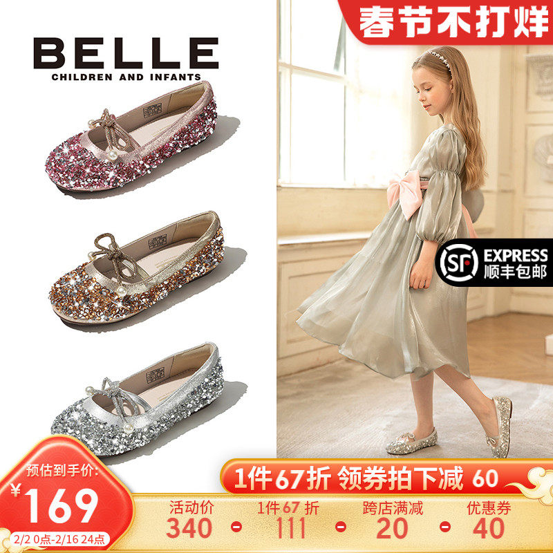 百丽童鞋女童公主鞋儿童皮鞋单鞋2024年春季新款小女孩水晶鞋软底