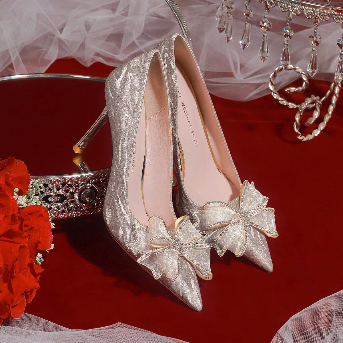 婚鞋新娘鞋主婚纱2023年秋冬新款银色高跟鞋女细跟订婚公主水晶鞋