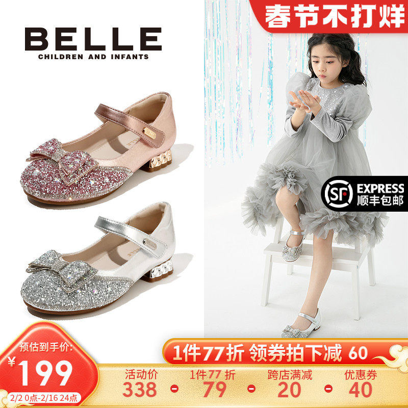 百丽童鞋女童小高跟公主鞋春季新款儿童水晶鞋时尚单鞋女童皮鞋子