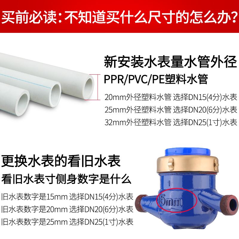 家用水表自来水4分6分旋翼式数字水表铜接头冷热水表防滴漏型水表