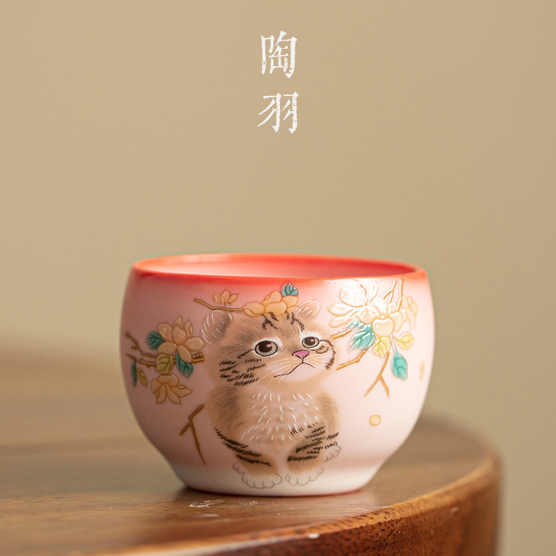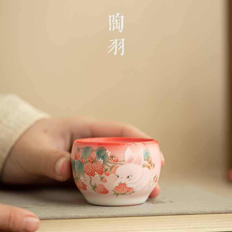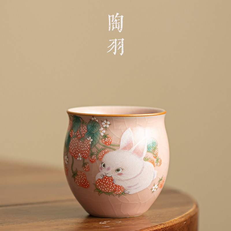 粉色汝窑草莓兔主人杯汝瓷个人单杯陶瓷功夫茶具小茶杯客杯品茗杯