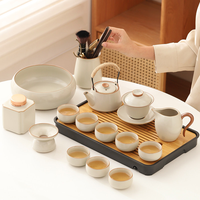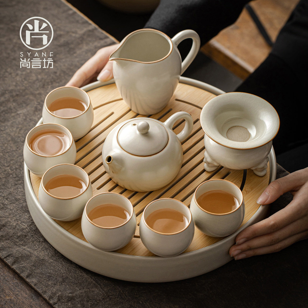 尚言坊 礼盒装汝窑功夫茶具套装家用泡茶壶轻奢高档全套圆形茶盘
