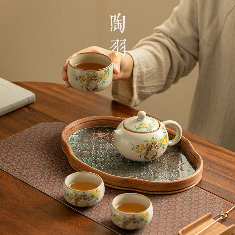 汝窑草莓兔提梁壶功夫茶具小套装家用办公泡茶壶茶杯干泡茶台盘