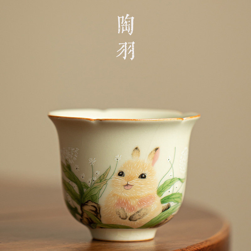 汝窑草莓兔主人杯束腰杯单杯开片高档个人专用功夫茶具陶瓷品茗杯