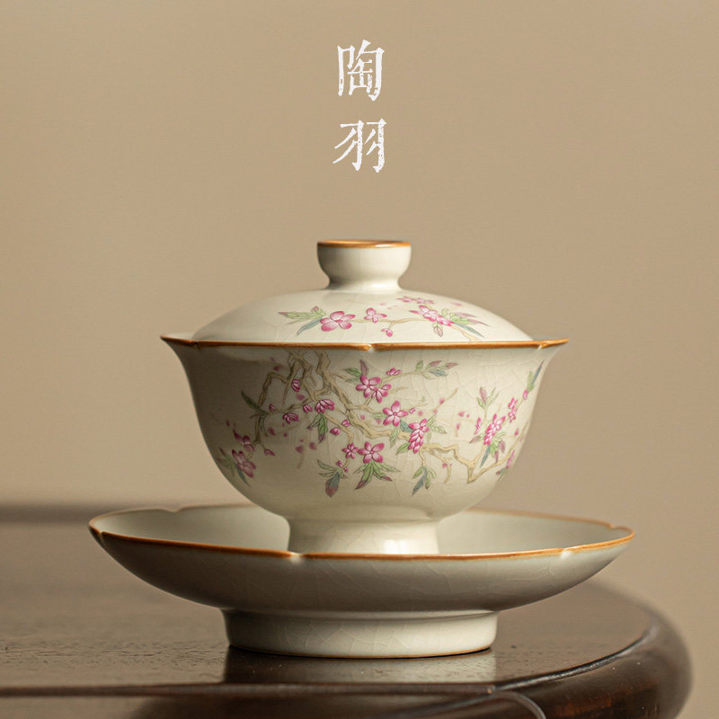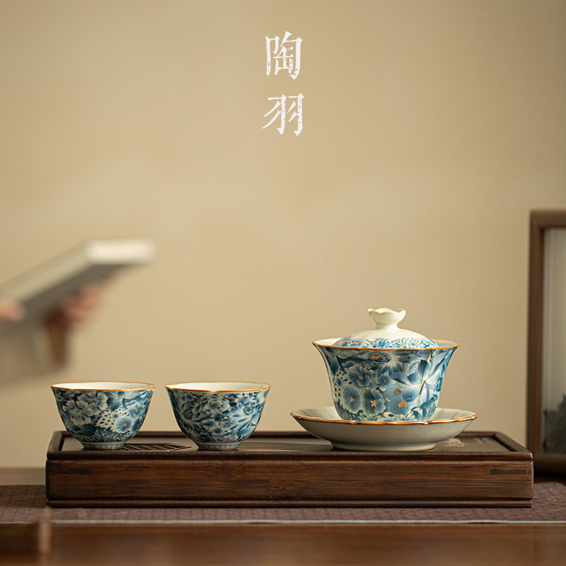 汝窑金万花陶瓷三才盖碗茶杯大号不烫手高档泡茶碗功夫茶具套装