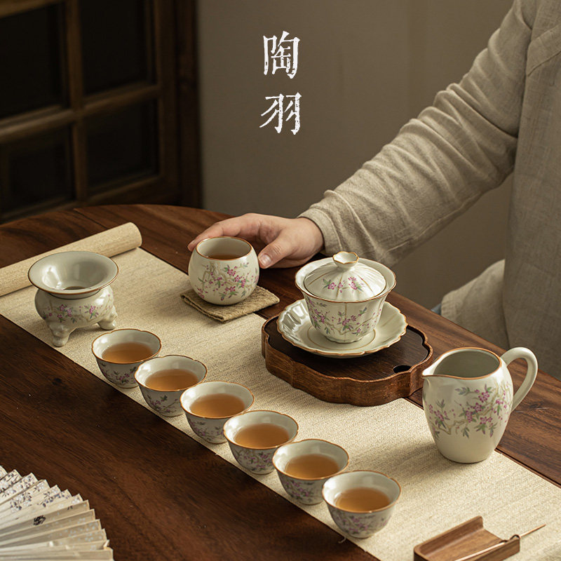汝窑金万花陶瓷泡茶壶盖碗杯子家用防烫茶壶茶碗喝茶功夫茶具套装