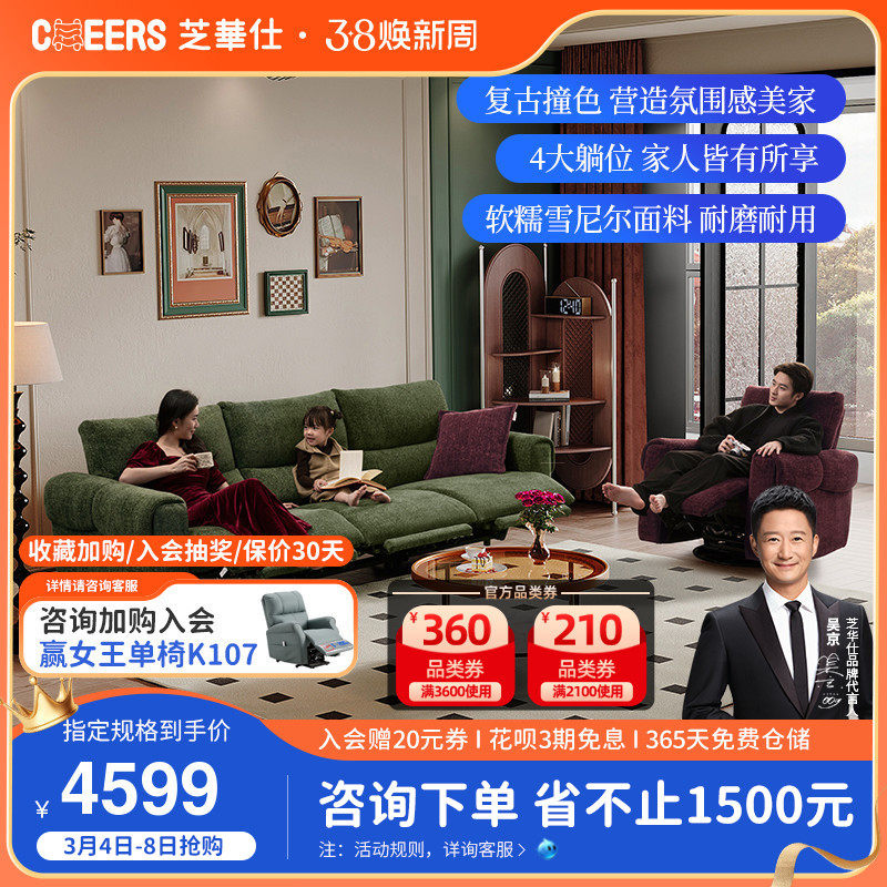 芝华仕头等舱雪尼尔法式复古绿色布艺中小户型智能电动沙发30209