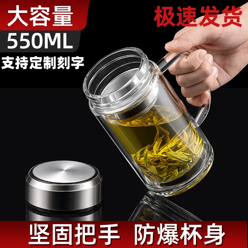 茶杯玻璃杯男双层带把手办公室个人专用泡茶杯大容量水杯家用杯子