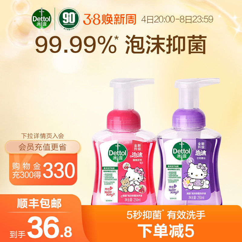 滴露玻尿酸泡沫洗手液250ml*2儿童泡泡抑菌家用按压装官方旗舰店