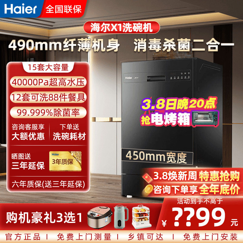 海尔洗碗机X1超薄8套嵌入式全自动家用小型超窄消毒独立式刷碗机