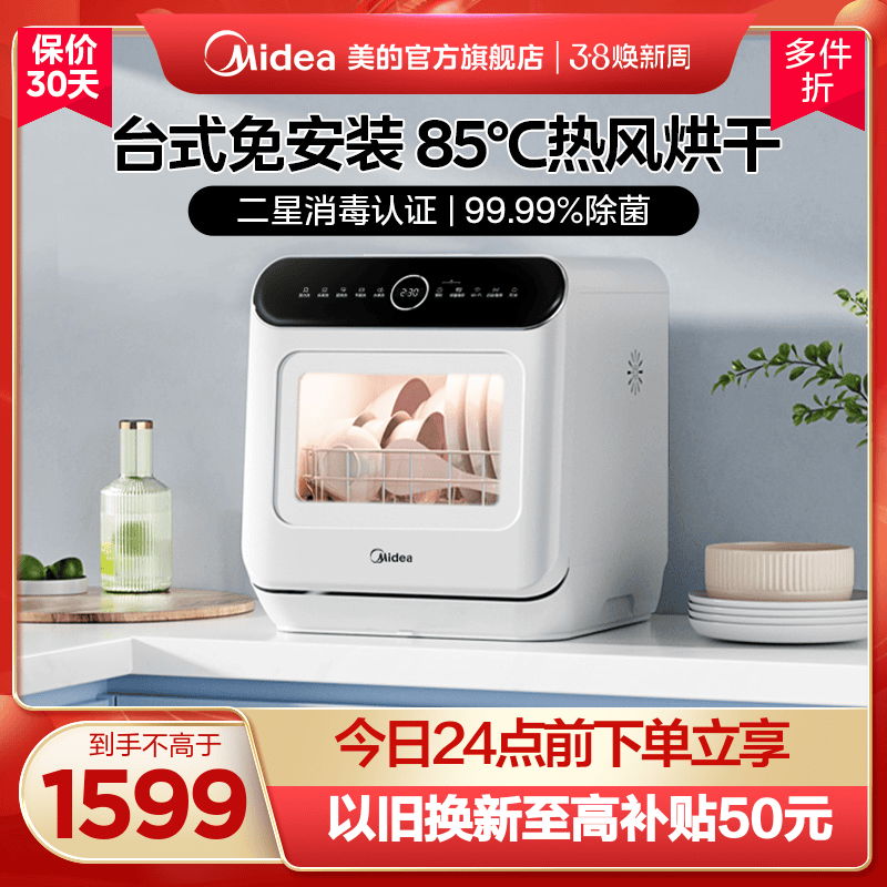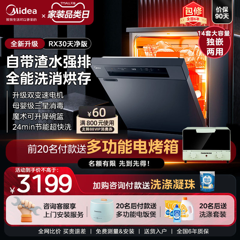 美的洗碗机全自动家用嵌入式台式大容量14套消毒RX600S天净600
