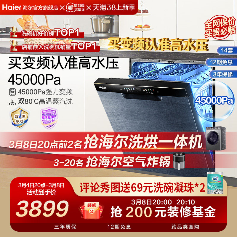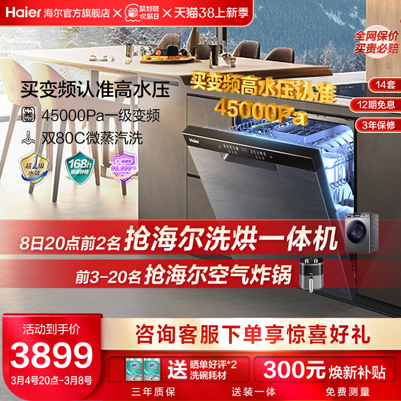 海尔洗碗机嵌入式全自动家用大容量14套智能小型变频消毒晶彩W30