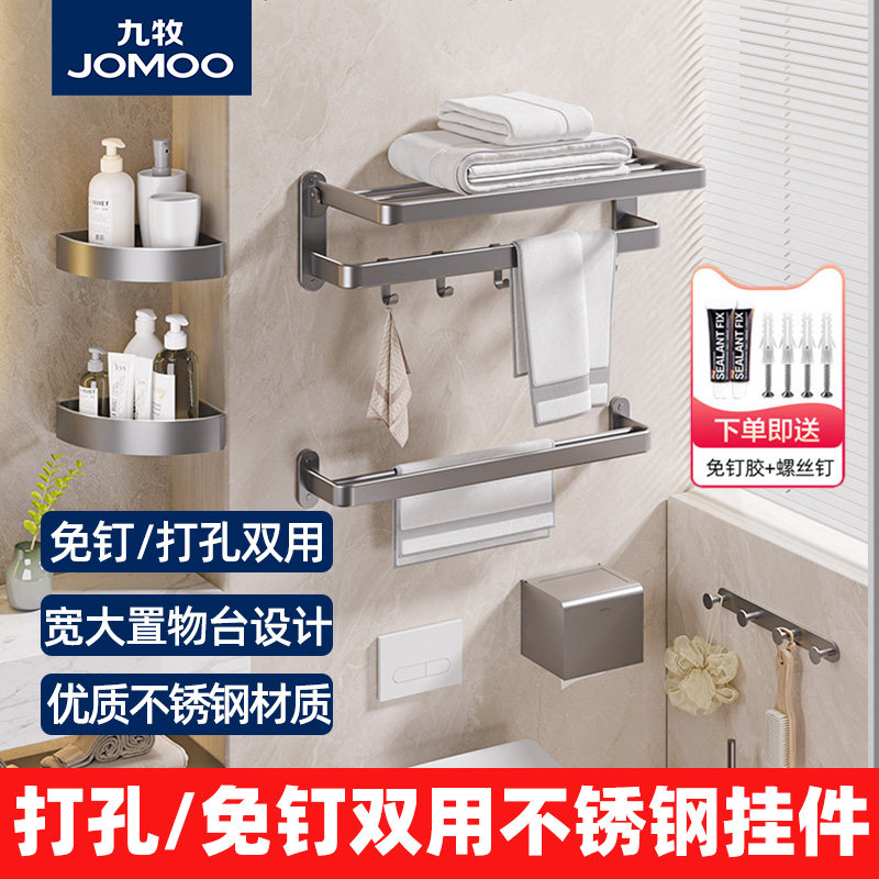 九牧双杆毛巾架毛巾挂免打孔置物架厕所卫生间浴室五金挂件不锈钢