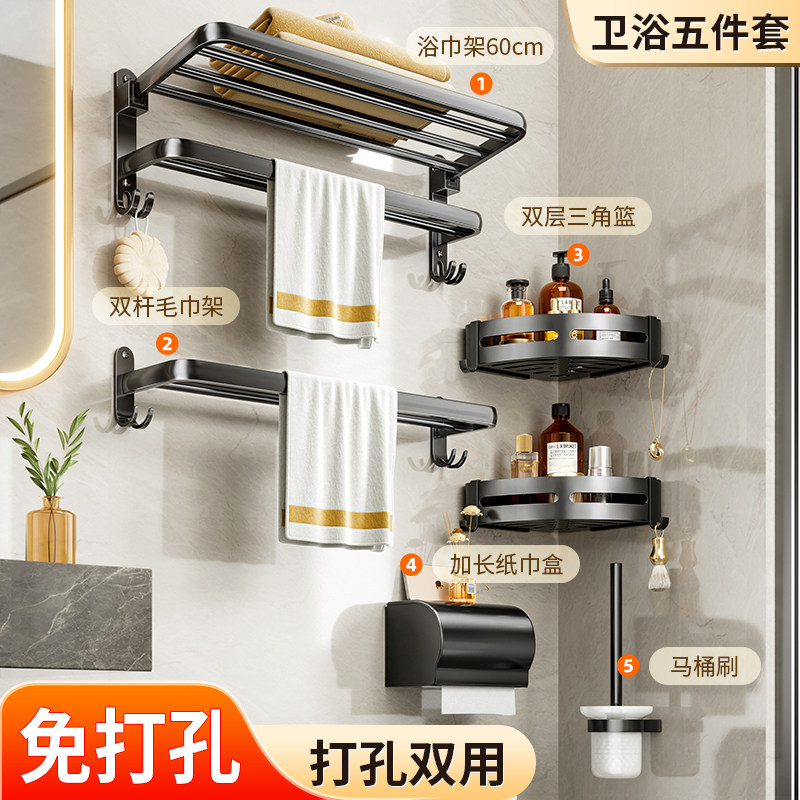 枪灰色毛巾架免打孔浴室浴巾置物架卫生间挂件五件套装洗手间厕所