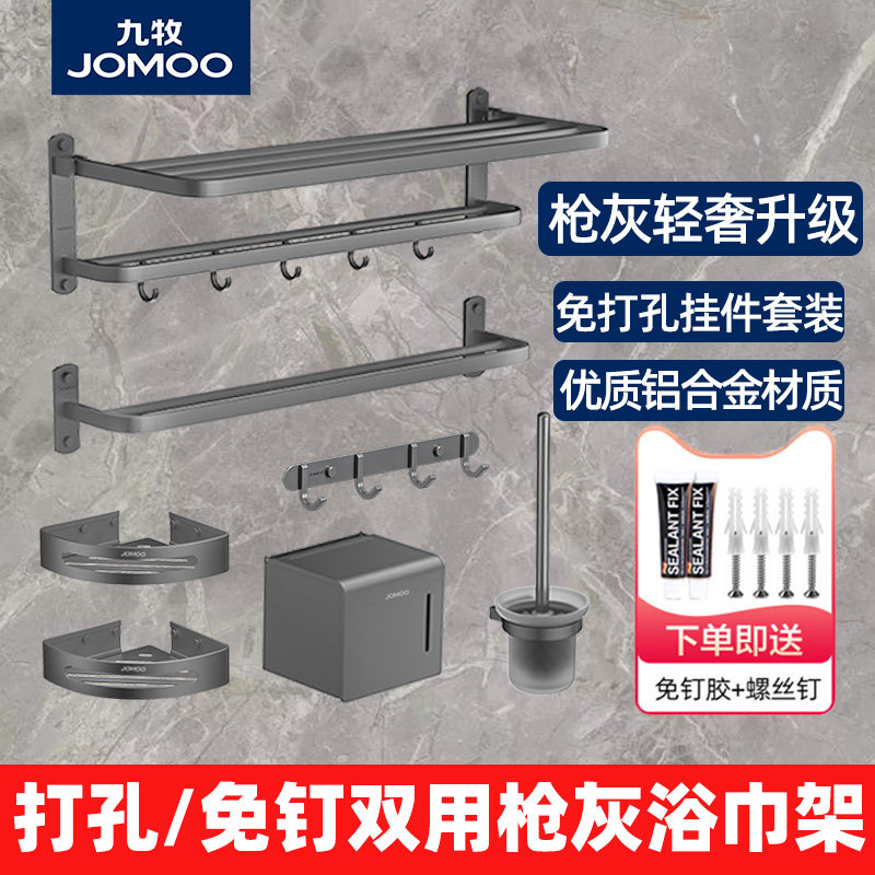 九牧轻奢枪灰色太空铝毛巾架免打孔卫生间置物架浴室厕所挂件套装