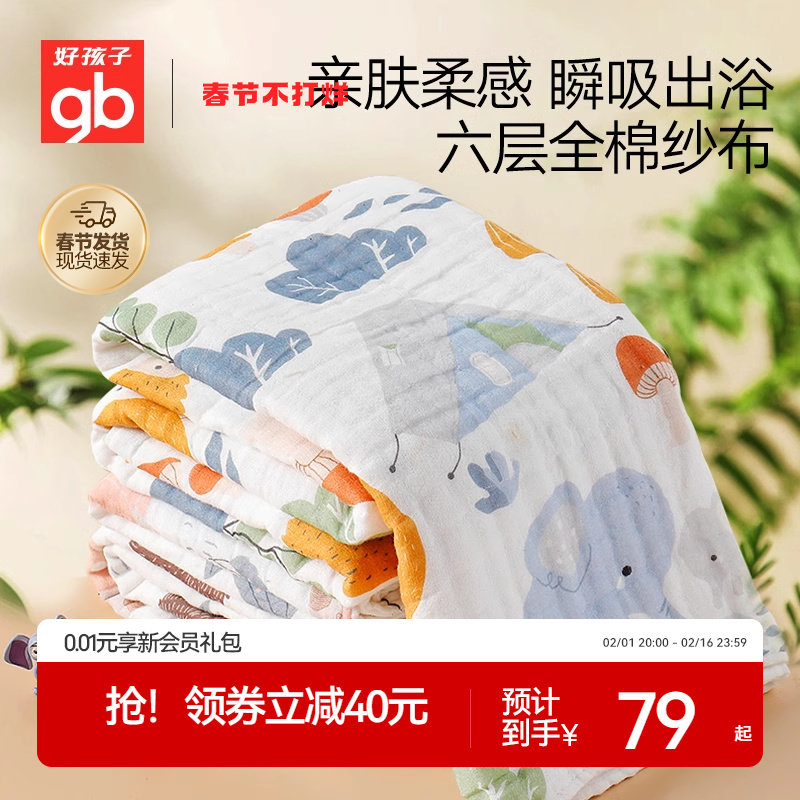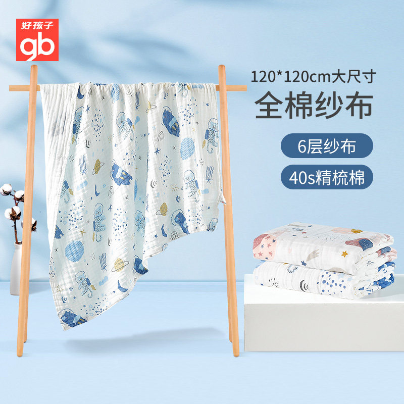 gb好孩子新生婴儿浴巾宝宝纯棉六层吸水纱布浴巾儿童洗澡裹巾
