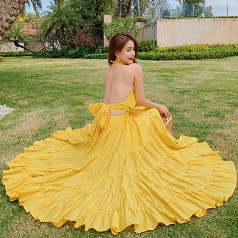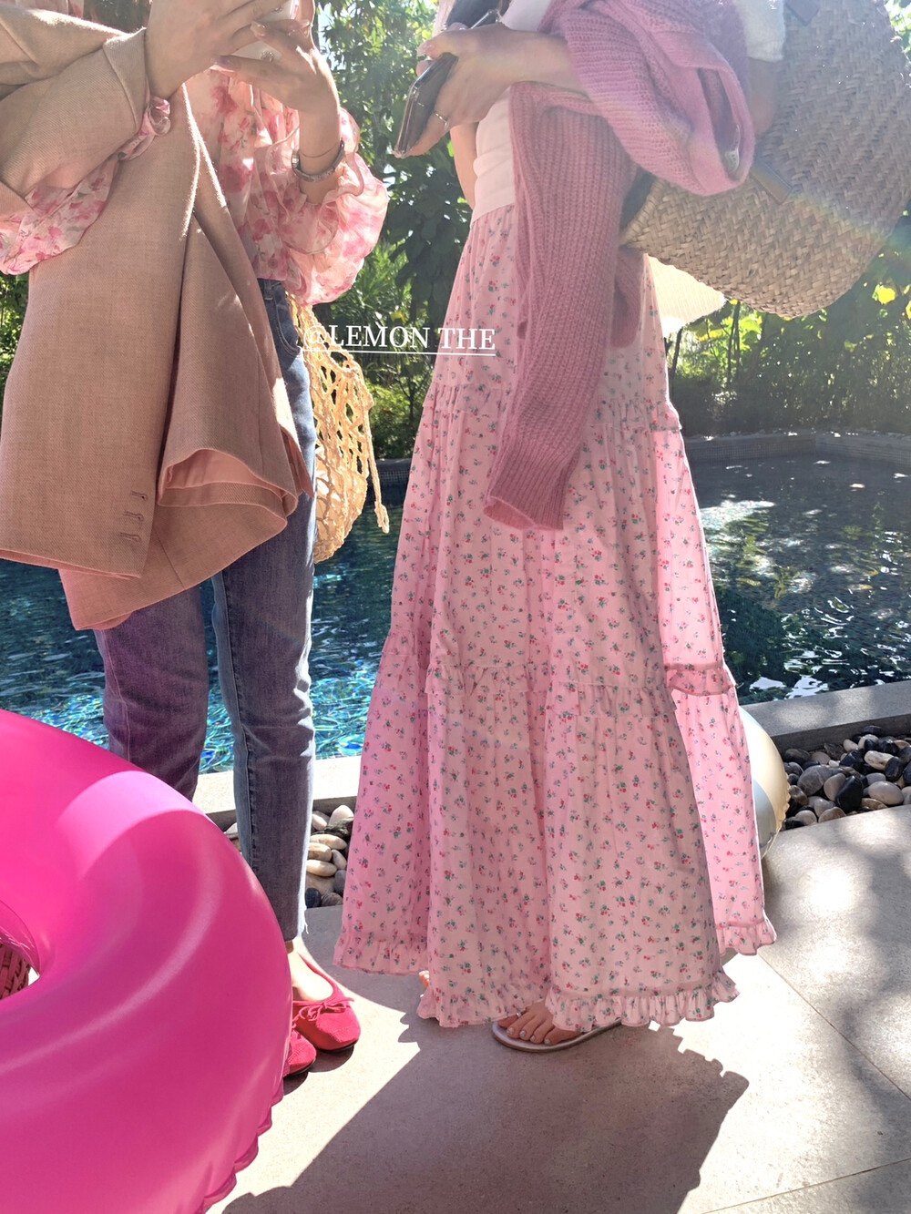 温柔甜美高腰海边度假风碎花木耳边大裙摆粉色a字蛋糕半身裙长裙