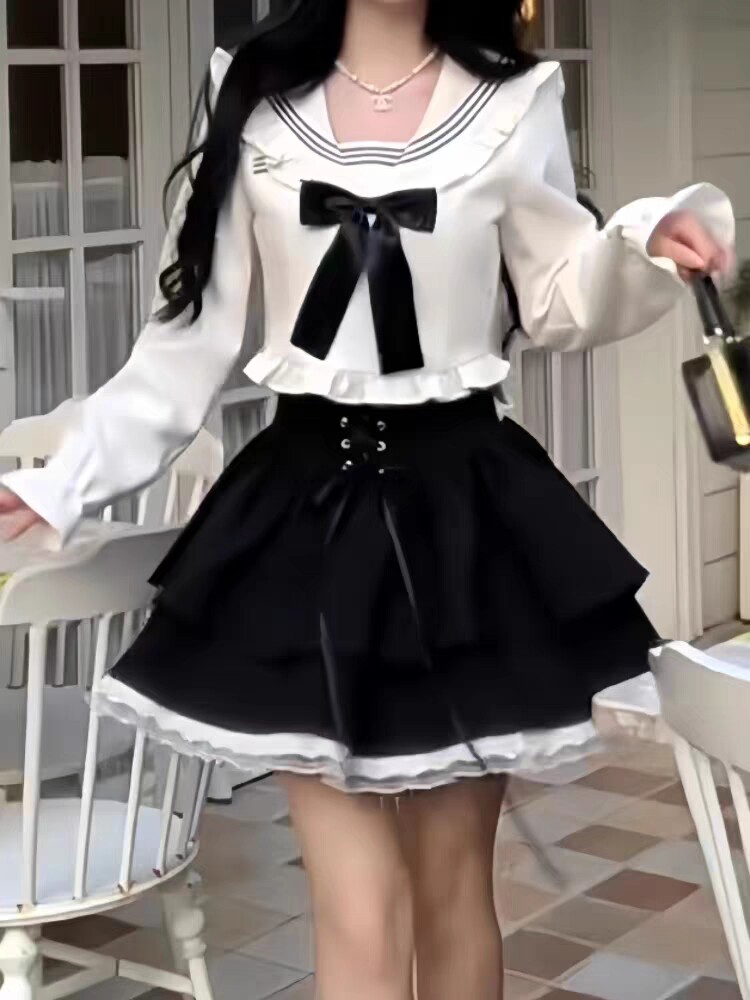 Blovelan慕蕾岚特 甜美学院风海军领蝴蝶结木耳花边短上衣秋新款
