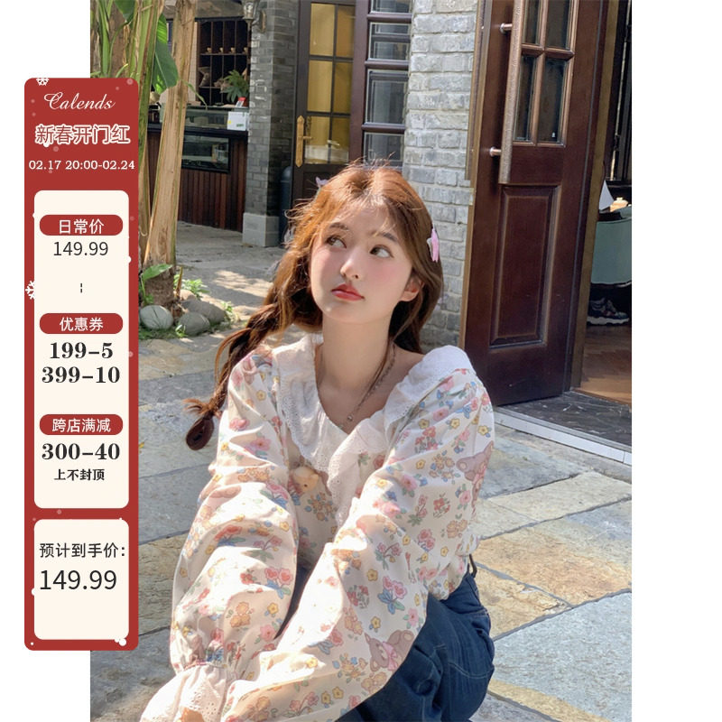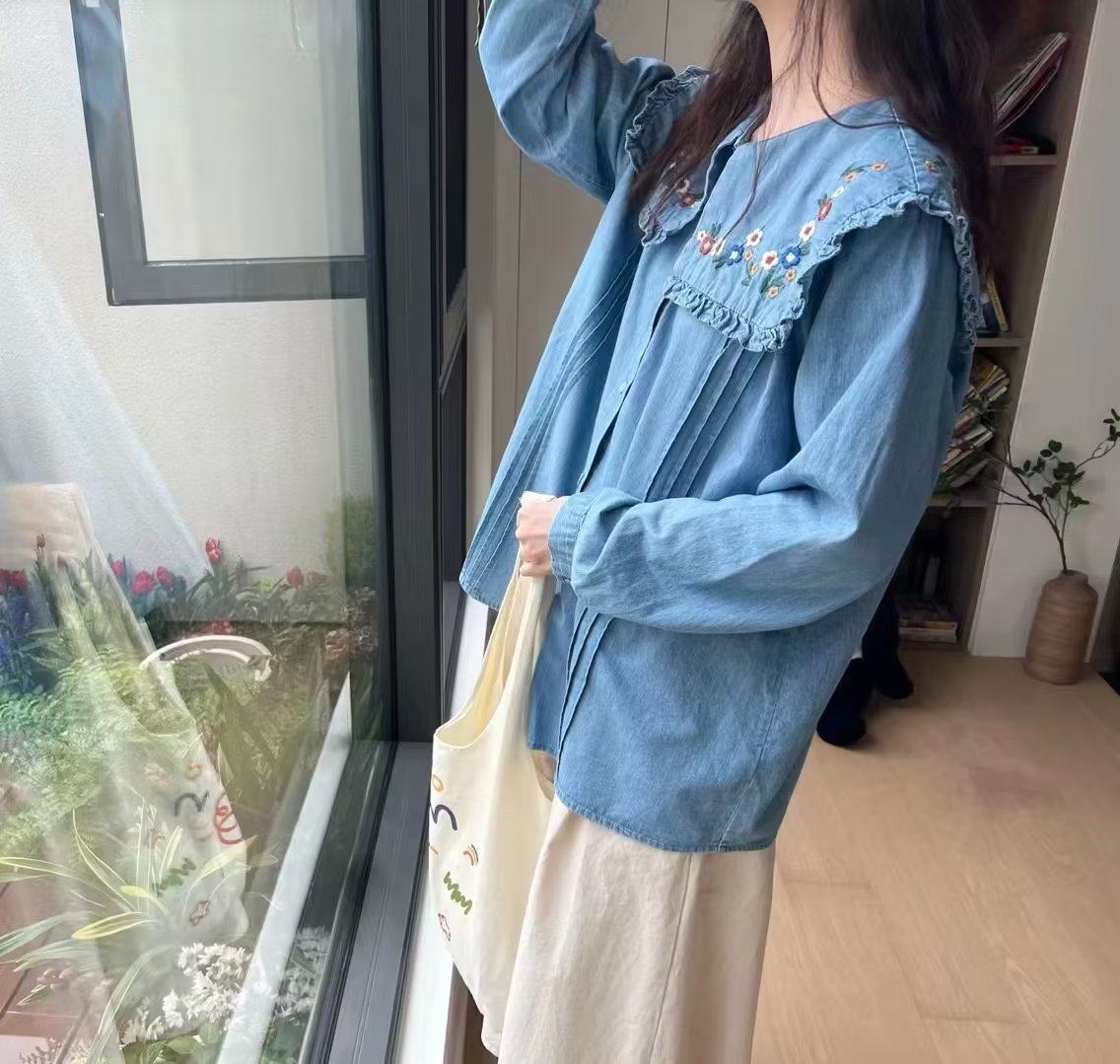 日系木耳边海军领娃娃领长袖牛仔衬衫女宽松重工刺绣花朵压褶上衣