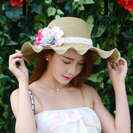 新款 度假沙滩帽 海边遮阳帽 夏天可折叠花朵太阳帽木耳帽