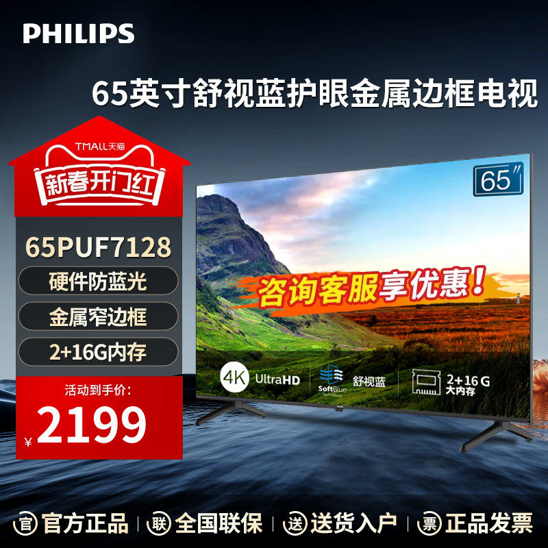 飞利浦电视55英寸舒适蓝护眼 金属窄边框4K高清液晶55PUF7128/T3