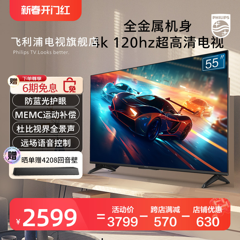 飞利浦55英寸专利护眼120hz全面屏语音智能液晶游戏电视机7808