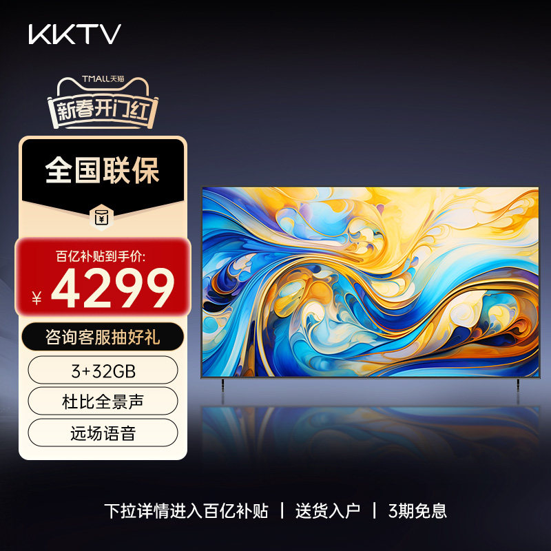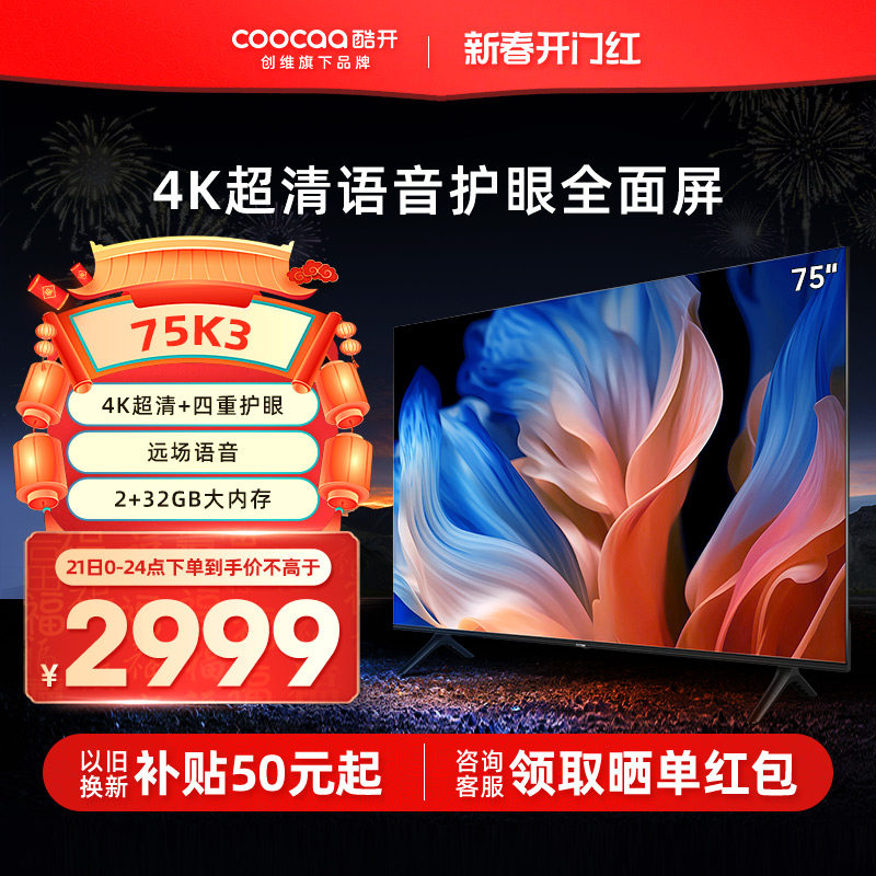 创维酷开K3 65英寸全面屏4K大内存网络智能投屏液晶家用电视机75