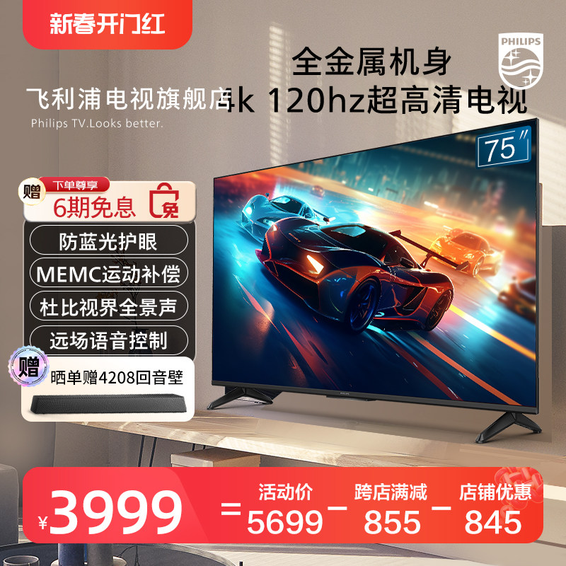 飞利浦75英寸专利护眼120hz全面屏语音智能液晶游戏电视机7808 65