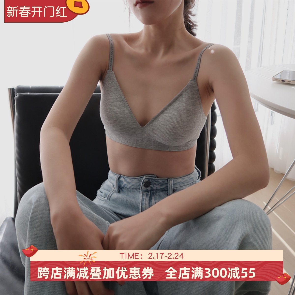 CK>女士内衣文胸三角无钢圈带胸垫深V性感聚拢吊带少女薄款百搭