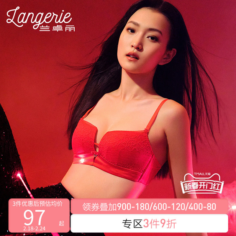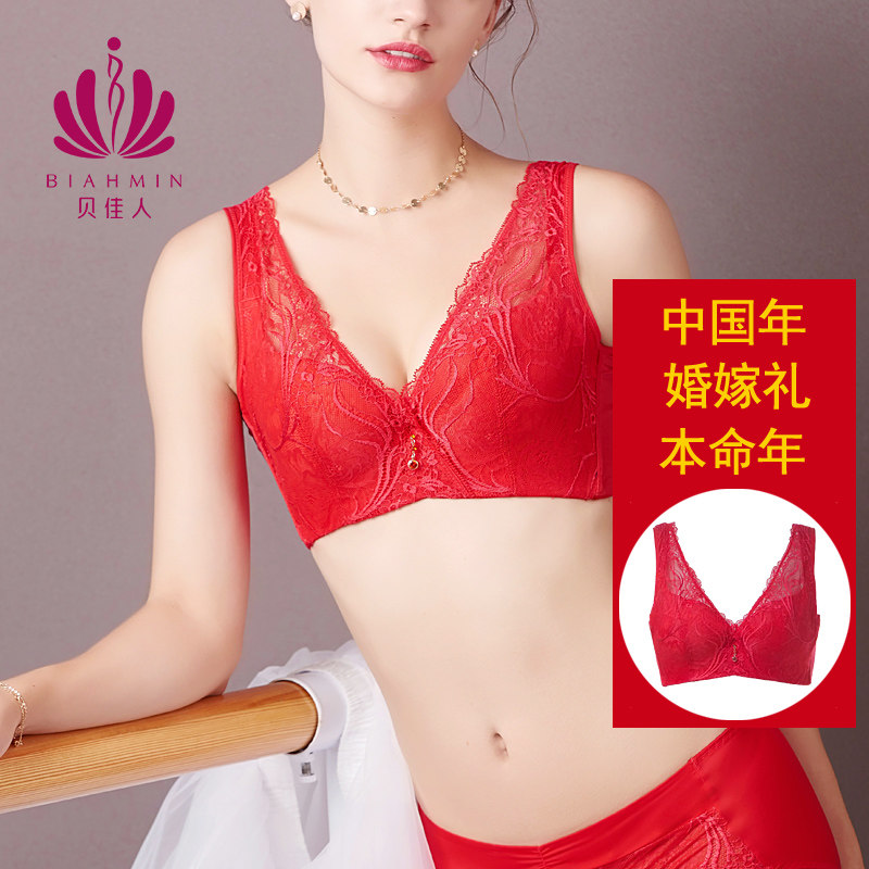 贝佳人红色好运喜庆内衣大胸显小背心式深V蕾丝软钢圈文胸BW96905