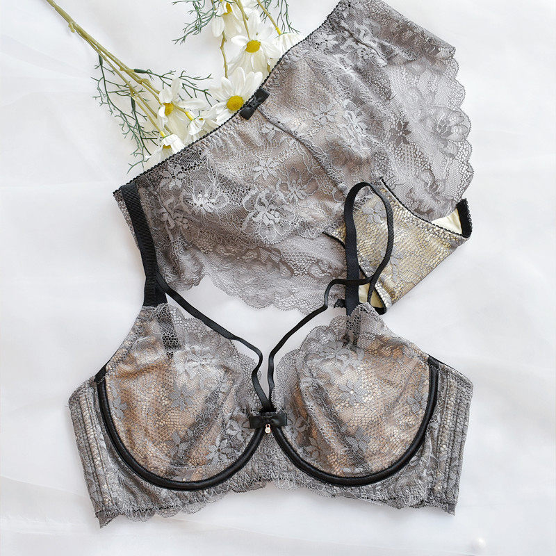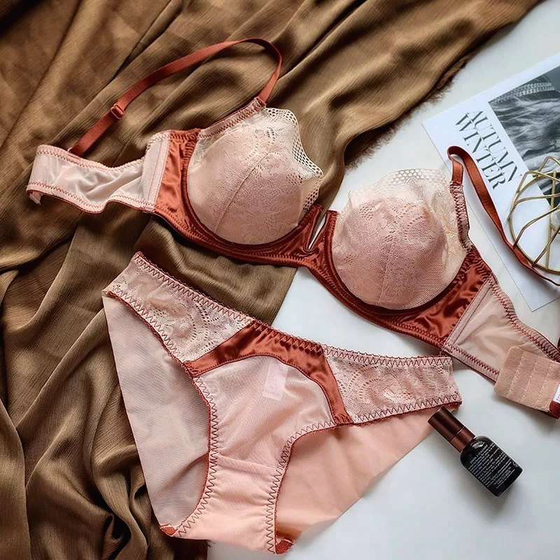 维多利亚轻奢法式深V性感缎面内衣女蕾丝拼接软钢圈薄夏上托套装