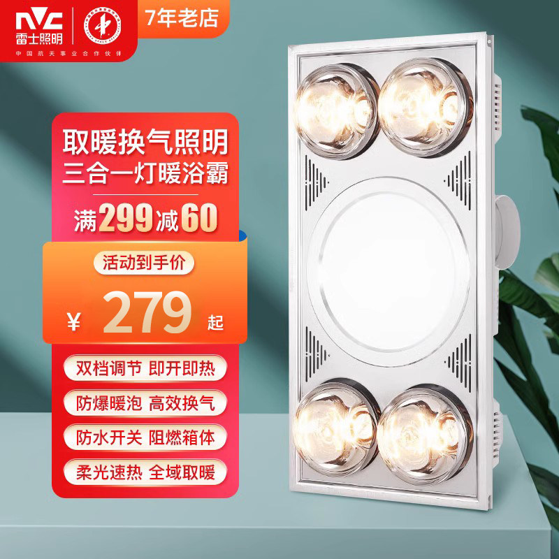 雷仕精家用取暖灯泡灯暖浴霸卫生间浴室嵌入式排气扇照明三合一