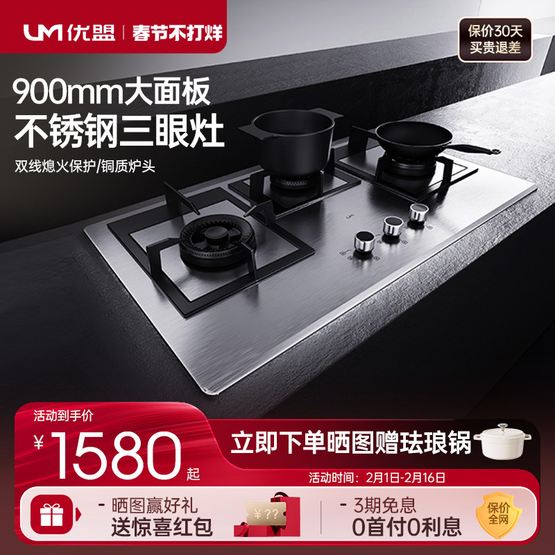 um/优盟 UZ301燃气灶嵌入式三眼灶具天然气液化三头灶家用不锈钢