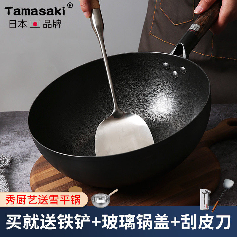 tamasaki铁锅日本无涂层不易粘锅平底老式大炒菜锅家用燃气灶适用