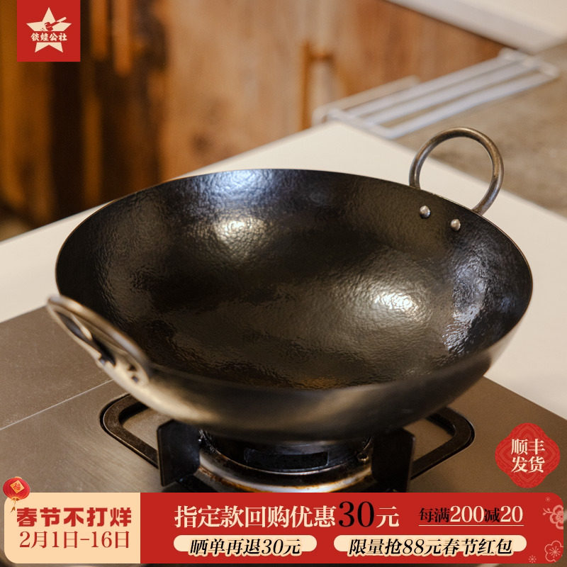 铁娃公社双耳圆底炒锅手工老式铁锅家用炒菜锅不粘锅燃气灶专用