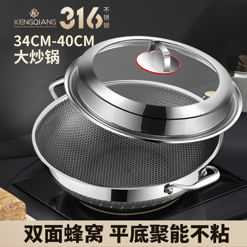 316不锈钢双耳炒锅大号不粘锅家用平底炒菜锅煤气电磁炉专用40cm