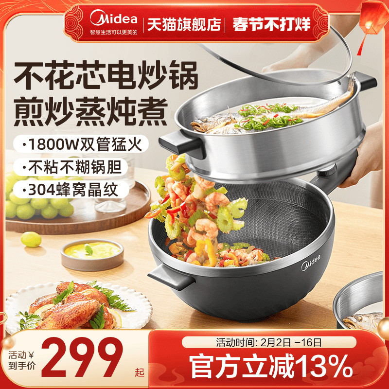 美的不花芯电炒锅家用多功能蒸煮电煮锅炒菜电热火锅大容量一体式
