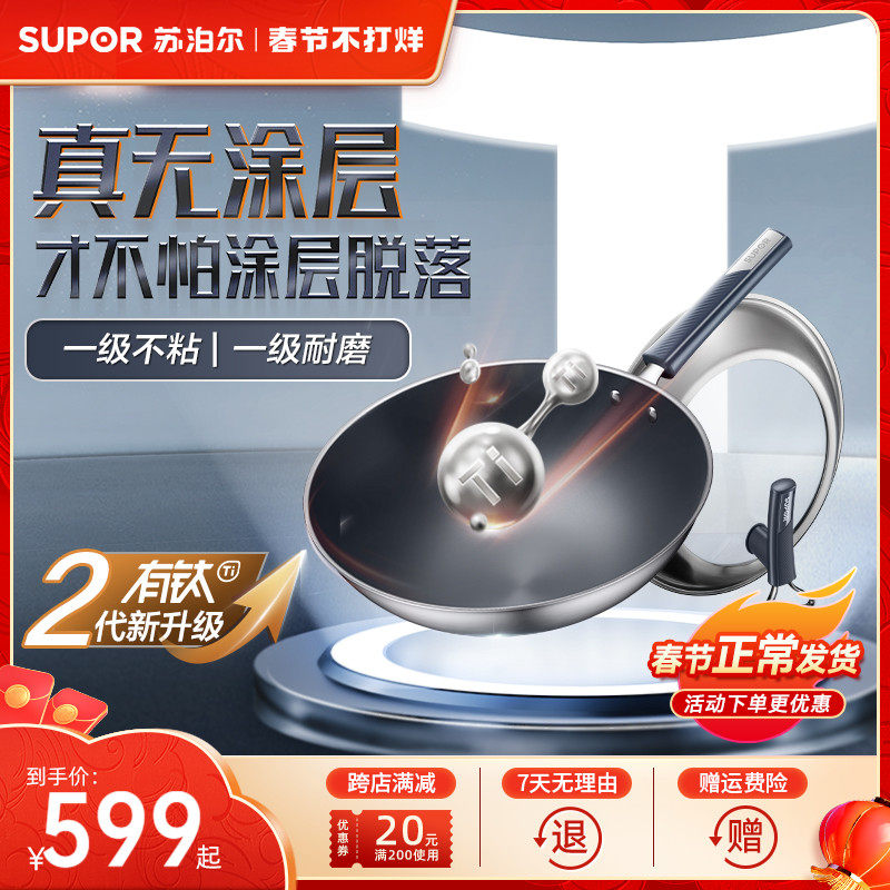 苏泊尔有钛炒锅家用无涂层不粘锅官方正品燃气灶炒锅