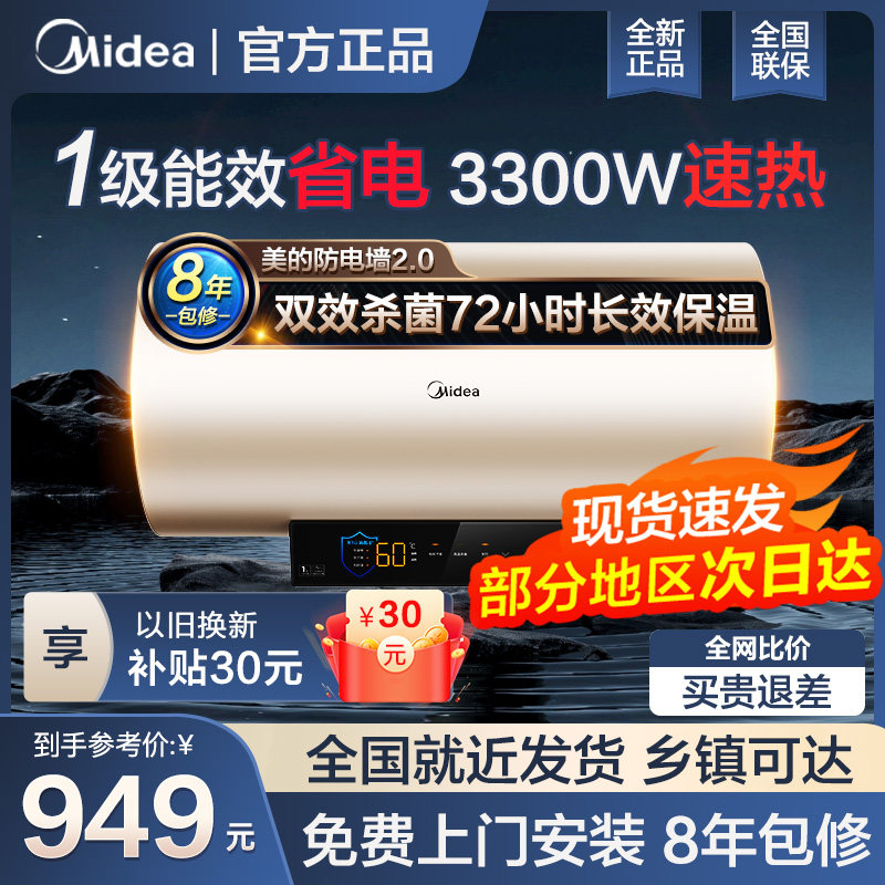 美的JE8电热水器变频3300W储水式一级能效家用60升免更换镁棒80升