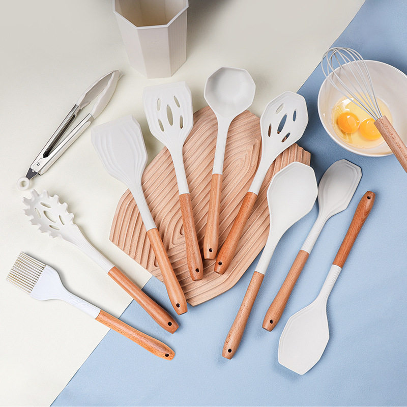 奶白木柄硅胶厨具11件套装不粘锅铲烹饪工具 厨房用具kitchen set