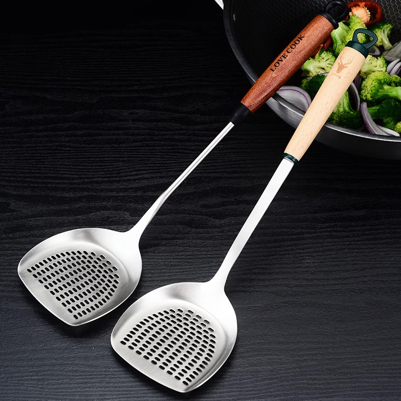 304不锈钢锅铲煎铲油炸捞勺加长木柄漏铲家用厨房用具烹饪多用铲